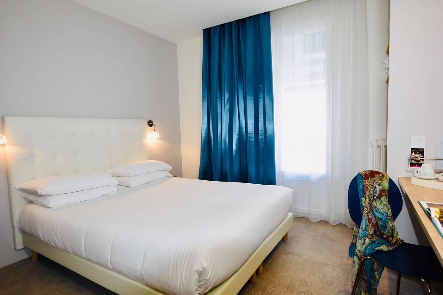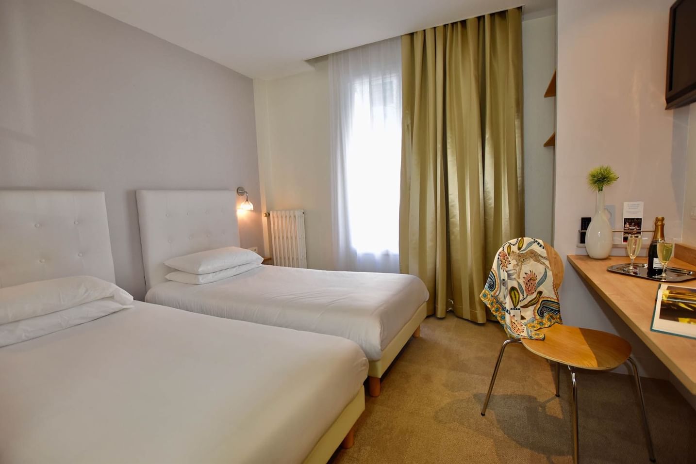 L’hôtel propose 32 chambres spacieuses, accueillantes et équipées d’un mobilier contemporain. Un parking privé, sécurisé et couvert à l’arrière de l’hôtel facilitera votre arrivée. Une attention particulière est également apportée à l’accueil, à la propreté de l’établissement et à la qualité du petit-déjeuner buffet : viennoiseries et pains spéciaux livrés tous les matins par le boulanger et servis encore tièdes aux «lève-tôt».