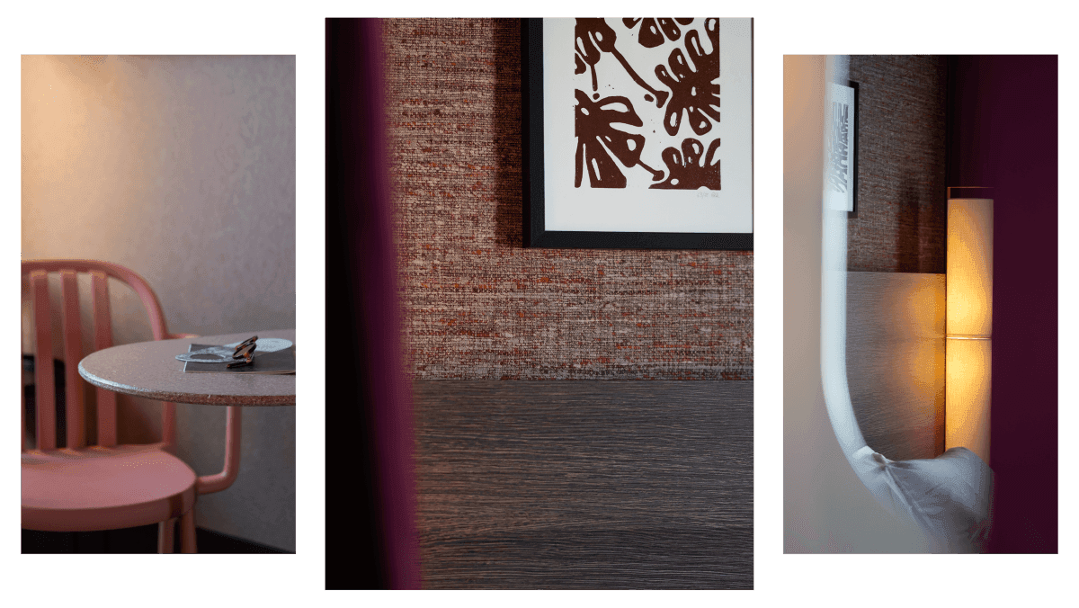 Dès l’extérieur, l’hôtel s’impose dans le tissu urbain avec sa façade caractéristique des années 70. À l’intérieur, tout a été revu : les circulations ont été fluidifiées, les volumes redessinés... Grâce à ses immenses baies vitrées, la lumière naturelle circule librement et le végétal s’invite partout : dans les chambres, dans le décor, dans le lobby… et surtout dans le patio central de 150 m², imaginé dans un esprit guinguette chic. Un espace vivant, joyeux, ombragé, où l’on partage un verre ou une conversation à ciel ouvert. La nature devient ici une vraie thématique, un fil rouge que l’on retrouve dans les teintes (terracotta, verts profonds, bois foncé), dans les textures (luminaires tressés, meubles en cannages…), et dans l’état d’esprit global de l’établissement : une ambiance douce et surtout accueillante.